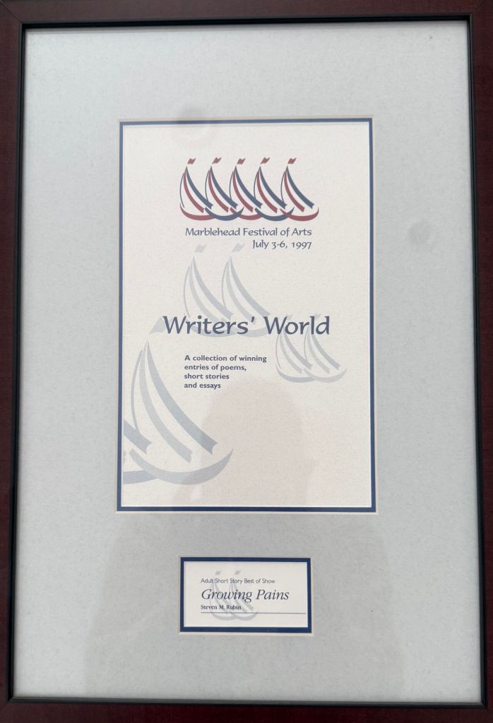A common question to me has been, “When did you start writing the book?” With some reflection, and some evidence below, I remembered I had submitted an abridged version of the fourth chapter into the 1997 Marblehead Festival of Arts and won Adult Short Story Best of Show. This chapter was the introduction of a new character, Tremont, and his entrance into the story felt like it could stand alone as a compelling short story. The judges apparently agreed.